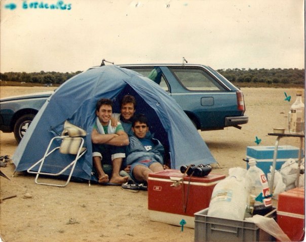 En la foto se ven los restos de una noche de juerga (innumerables botellas vacías); tan solo puntualizar que había mas tiendas de campaña y mas gente- no éramos tan colgados de irnos solo tres- En la foto solo sale la nuestra: Peter, Carlos y el que suscribe. Y es que aunque dormíamos poco mas de cuatro horas , al día siguiente estábamos como un reloj suizo: listos para seguir disfrutando del día pantanero. Si intentara algo similar hoy en día muy probablemente caería fulminado de un infarto